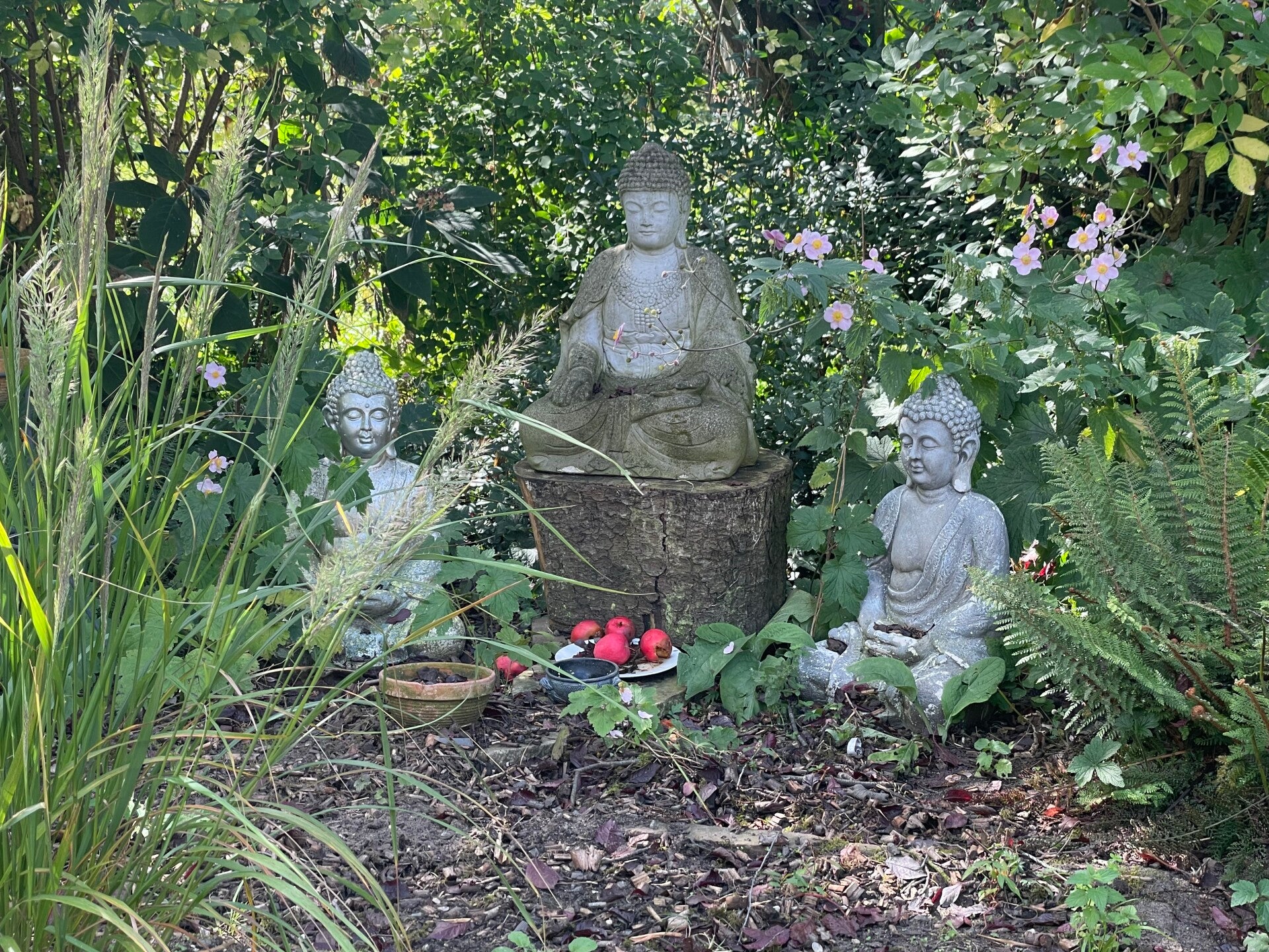 De Boeddhabeelden en Altaren zijn niet perse hier als symbool voor Boeddhisme. Het Altaar en de beelden in het hofje staan voor de Spirits van de tuin. De drie beelden in de Tempeltuin (tegenover de Tempelkamer) staan voor Boeddha, Dharma en Sangha. Dit zijn drie Boeddhistische termen die respectievelijk betekenen: de Boeddha, de Leer en de Gemeenschap van gelovigen.